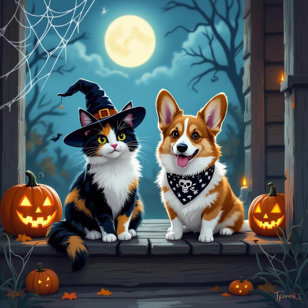 This image shows a calico cat with a witch hat and a corgi with a bandana on a rustic porch with pumpkins. It is painted in a whimsical digital art style with bold colors and a spooky enchantment.