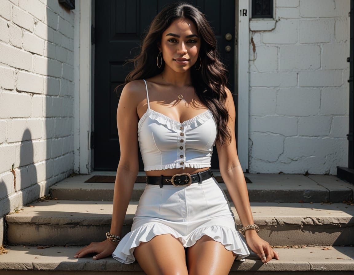 This image shows a sensual, athletic, 35-year-old Mexican woman with dark hair and amber eyes. She is leaning against a wall in a neighborhood wearing a ruffled skirt and crop top, captured in a highly detailed, full-body photo with expressive lighting.