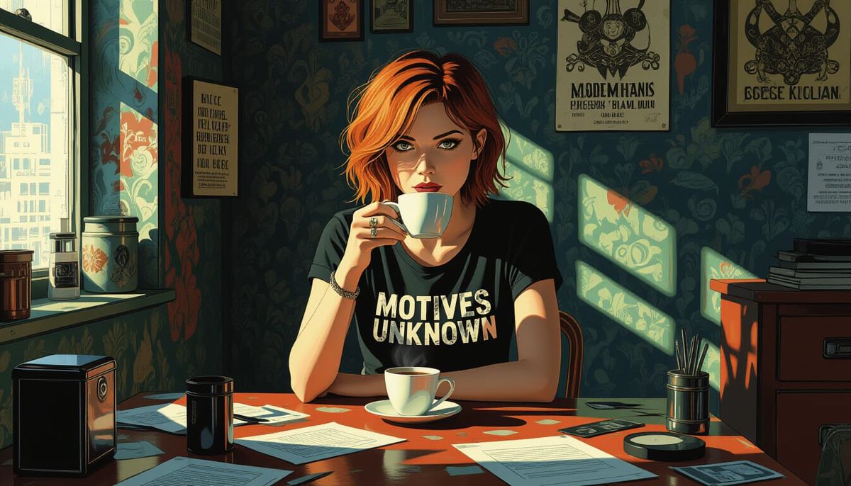 This image shows a ginger woman with short hair drinking coffee in a grungy apartment. The art deco-inspired image features intricate patterns, metallic accents, and eerie shadows in a surreal, dystopian style.