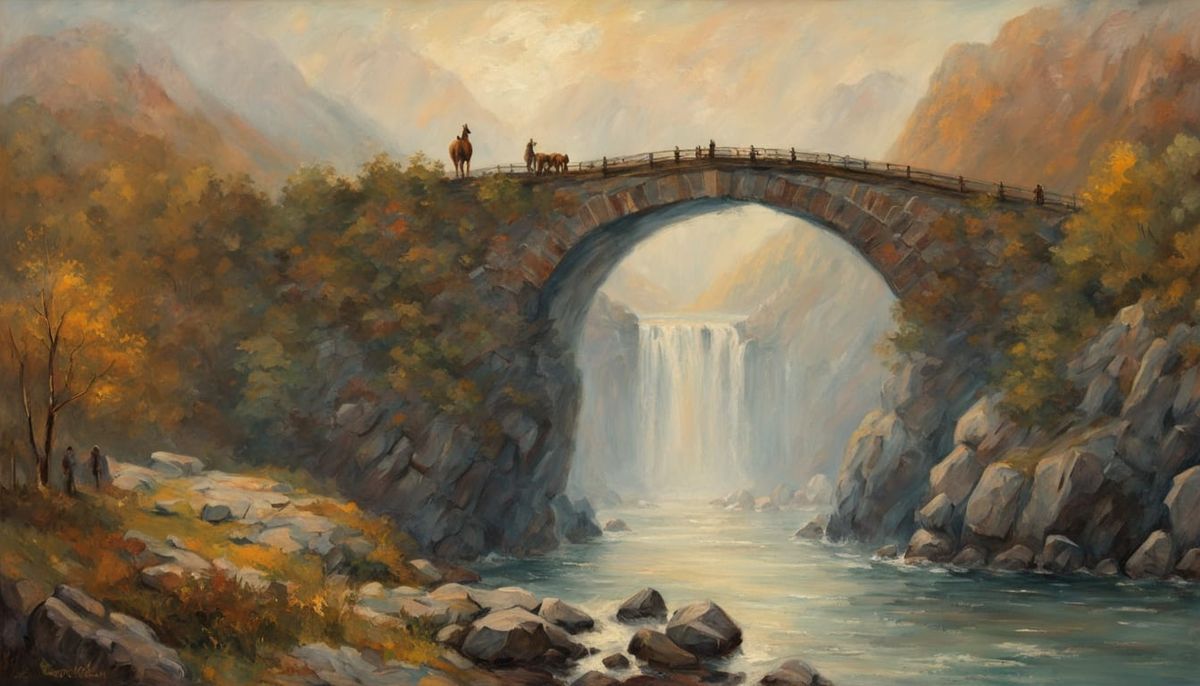 This image depicts a kangaroo standing on a rock by a river, with a rustic bridge in the distance, set against a misty, dreamy background. Created in a Baroque style, the painting features bold, expressive brushstrokes and vibrant colors, with soft textures and impasto details on rocks and bridge.