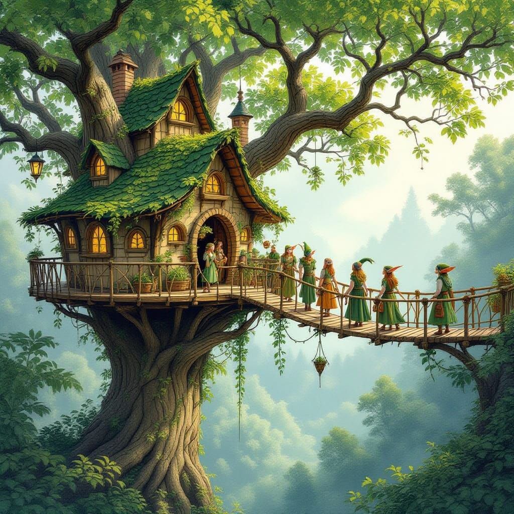 This image shows a fantastical treehouse village, suspended high above the forest floor, with intricate wooden structures and lush greenery. Delicate bridges connect the treetop dwellings, where elves in earth-toned garments mill about a bustling market amidst dappled light.