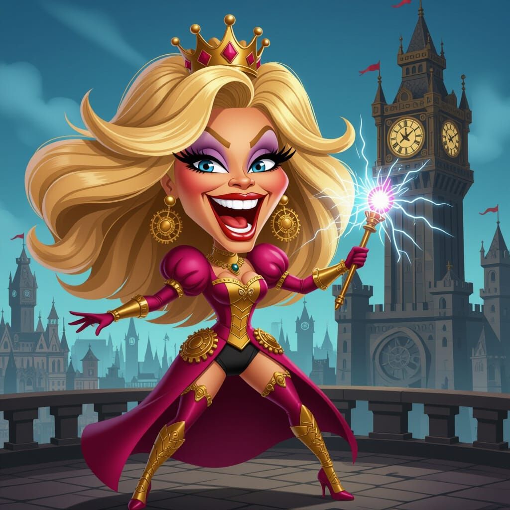 This image shows a steampunk automaton reimagined as Tina Turner, the Queen of Hearts. It features intricate gears, brass plating, and a Tesla coil scepter, set against a smog-filled Victorian city.