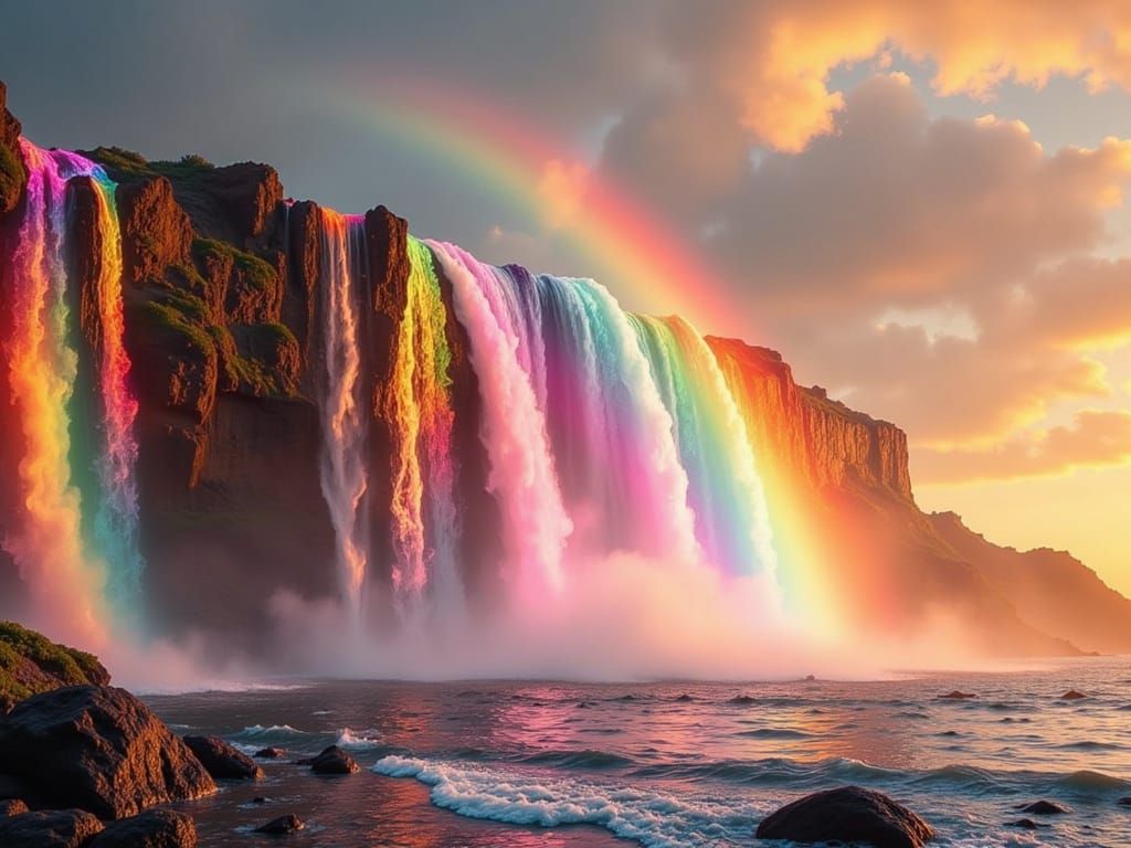 This image shows a vibrant, colorful scene of luminescent raindrops creating rainbows. Waterfalls cascade into an ocean, transforming it into a rainbow of color, rendered with dreamcore aesthetics.