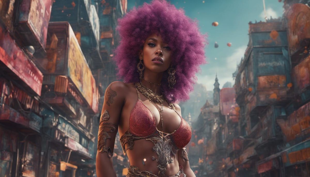 This image shows a hip hop queen in daring attire. The digital matte painting features deep colors, intricate details, and complementary hues in a fantasy concept art style.