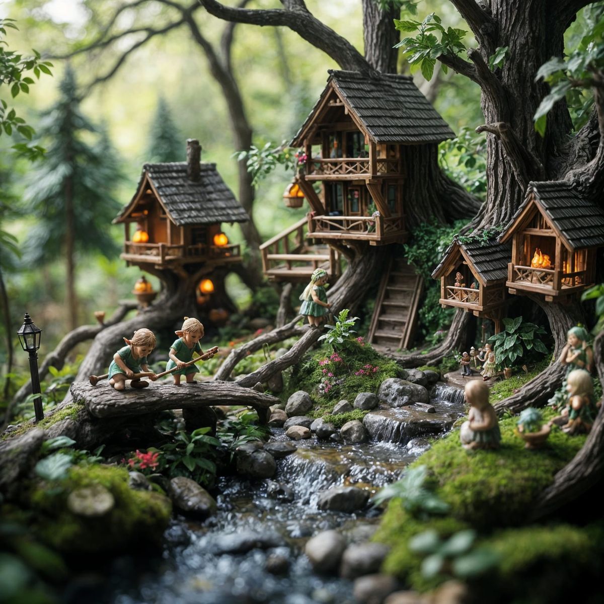 A vibrant 8K photograph of an elven community nestled in a meticulously detailed miniature world. The idyllic scene features elaborate treehouses, flowing streams, and soft, magical lighting.