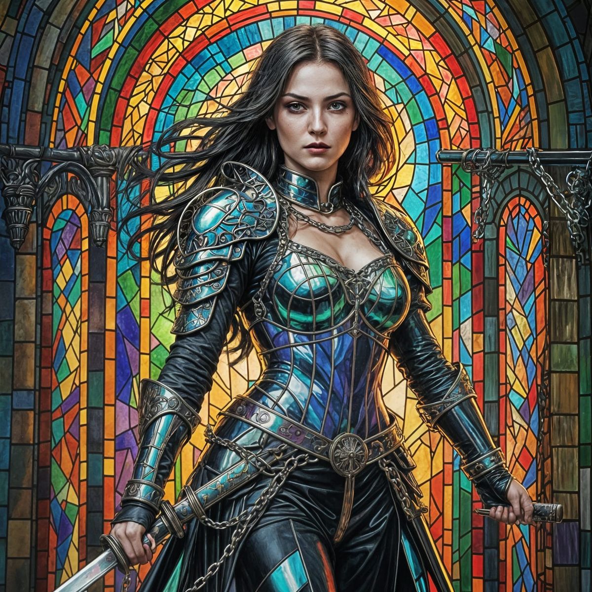 This image shows a colorful gothic warrior maiden in a stained glass aesthetic, wielding a katana and chain whip in a fantastical scene.