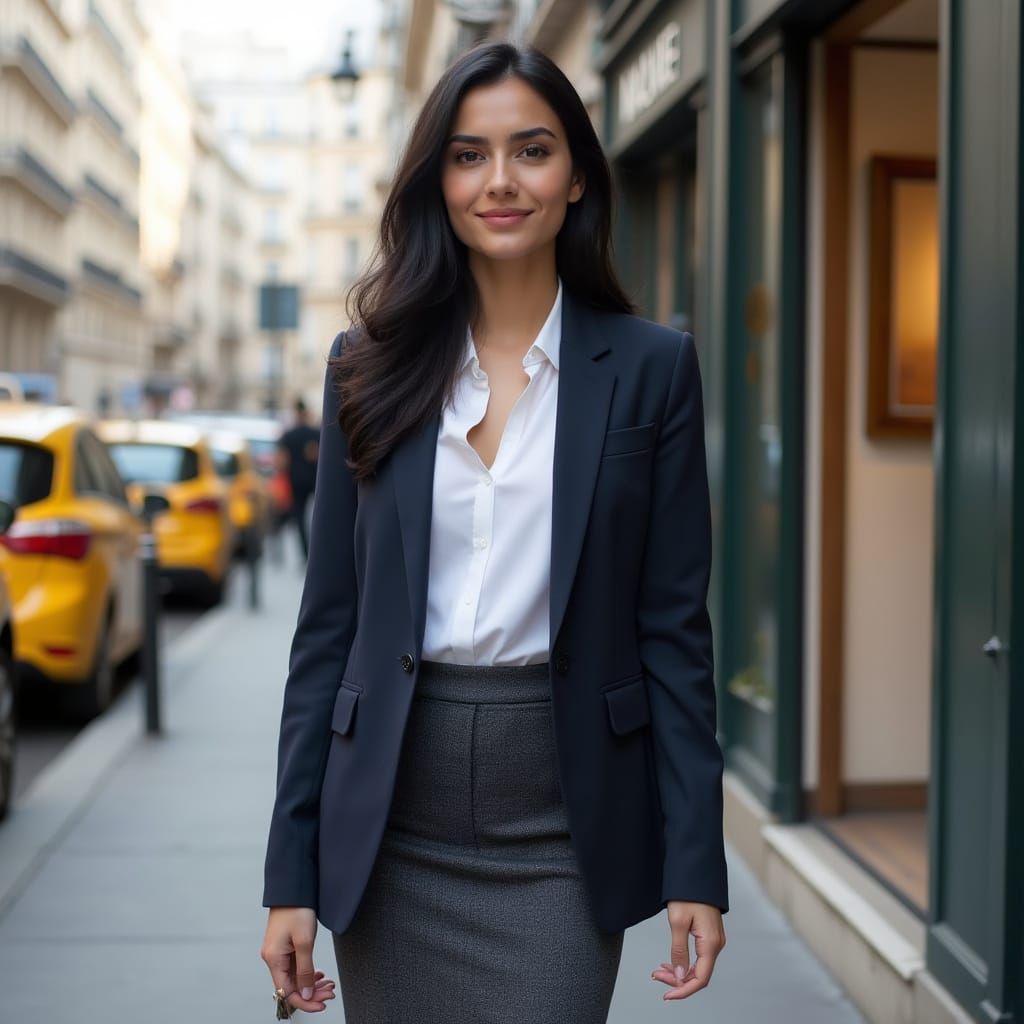 This hyperrealistic photograph captures a 30-year-old American woman with black hair, professionally dressed in a blazer and skirt, standing on a busy Paris street near an art gallery.