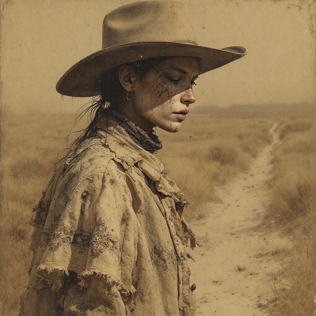 This image depicts a solitary figure on a dusty frontier path, rendered with granular textures and airborne debris. The scene evokes a sense of weathered resilience and temporal erosion in sepia tones.