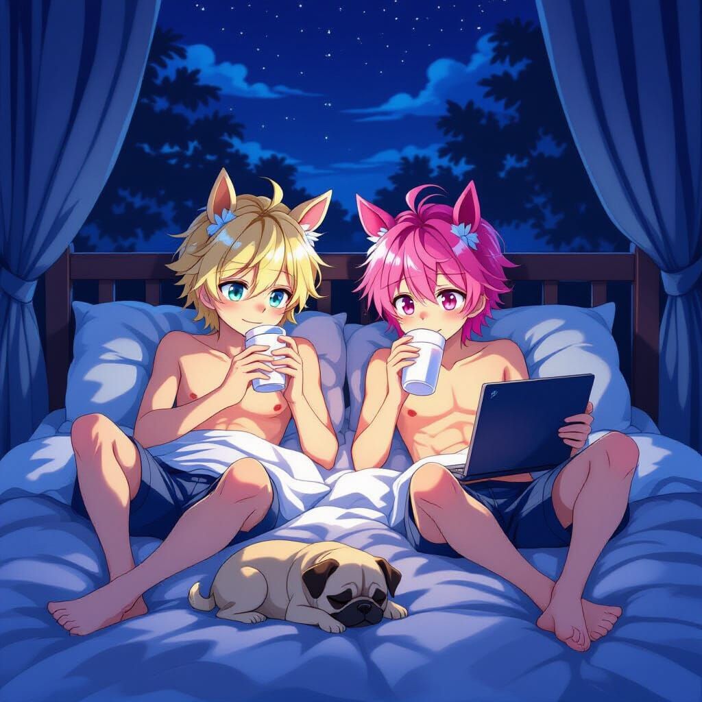 This image showcases two anime-style young men with horse ears relaxing in bed on a hot night. They are using laptops and drinking milk, accompanied by a sleeping pug, with a vibrant cel-shaded aesthetic.