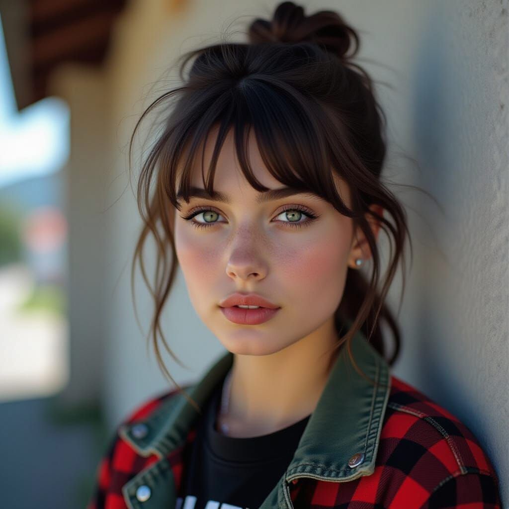 A captivating image of a 17-year-old Czech punk girl. Shot with vivid colors and film grain, the portrait features dramatic chiaroscuro lighting and a shallow depth of field, emphasizing her piercing gaze.