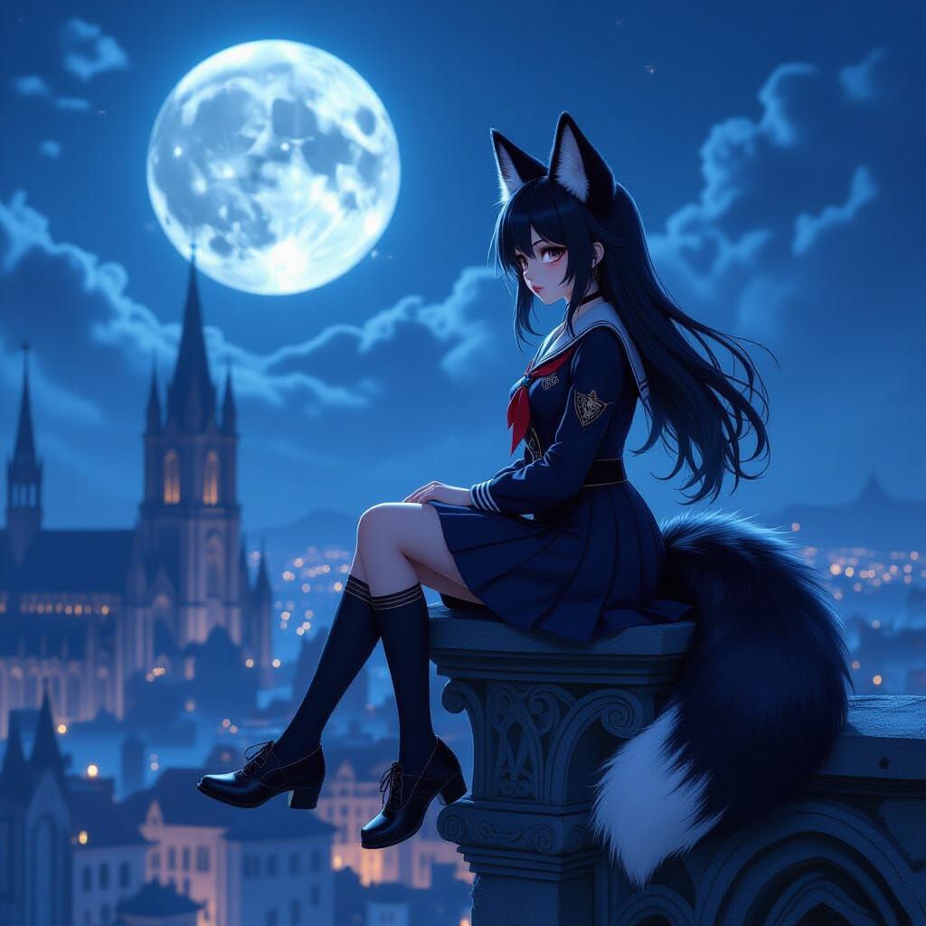 This image shows a fox-eared girl in a dark academia uniform sitting atop a cathedral gargoyle. Overlooking a moonlit cityscape, the scene features an ethereal glow and shadow contrast in a 3D anime aesthetic.