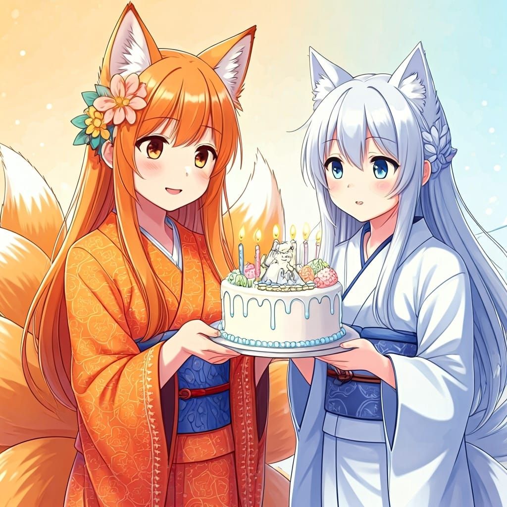 This image depicts two anime fox girls celebrating a birthday. One holds a cake with wolf decorations, while the other, with white hair and wolf ears, looks surprised and delighted in this manga-style artwork.