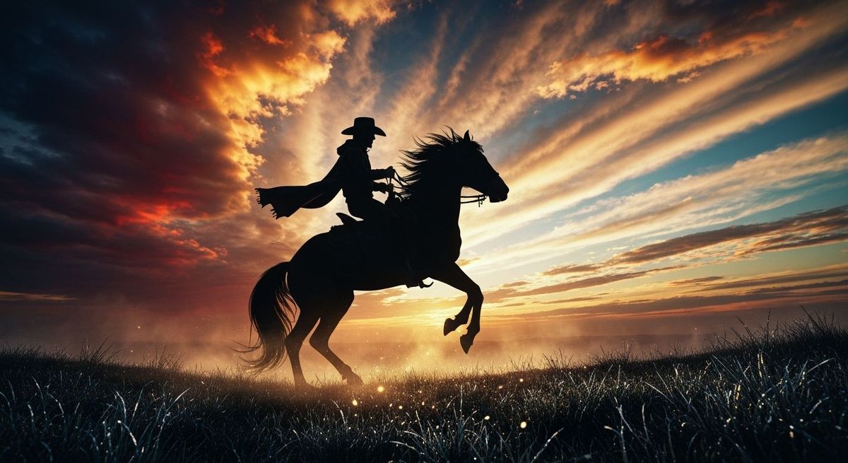 A hyperrealistic cinematic photo of a cowboy on a rearing horse silhouetted against a fiery, dramatic sunset. Intense backlight and atmospheric mist create a powerful, striking scene.