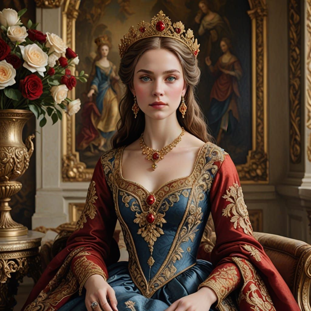 A stunning digital painting of a beautiful woman in a classical setting, adorned with gold jewelry, an ornate crown, and a flowing red dress, surrounded by lush flowers and soft, warm lighting.
