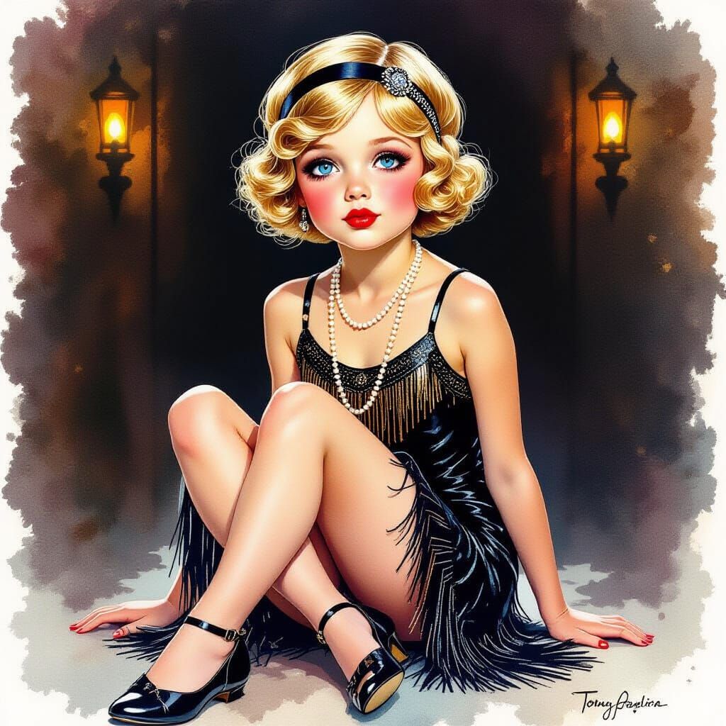 A vivid watercolor of a flapper girl in a black dress, sitting with legs crossed. The image features warm, golden lighting and intricate, hand-painted details in a digital art style.