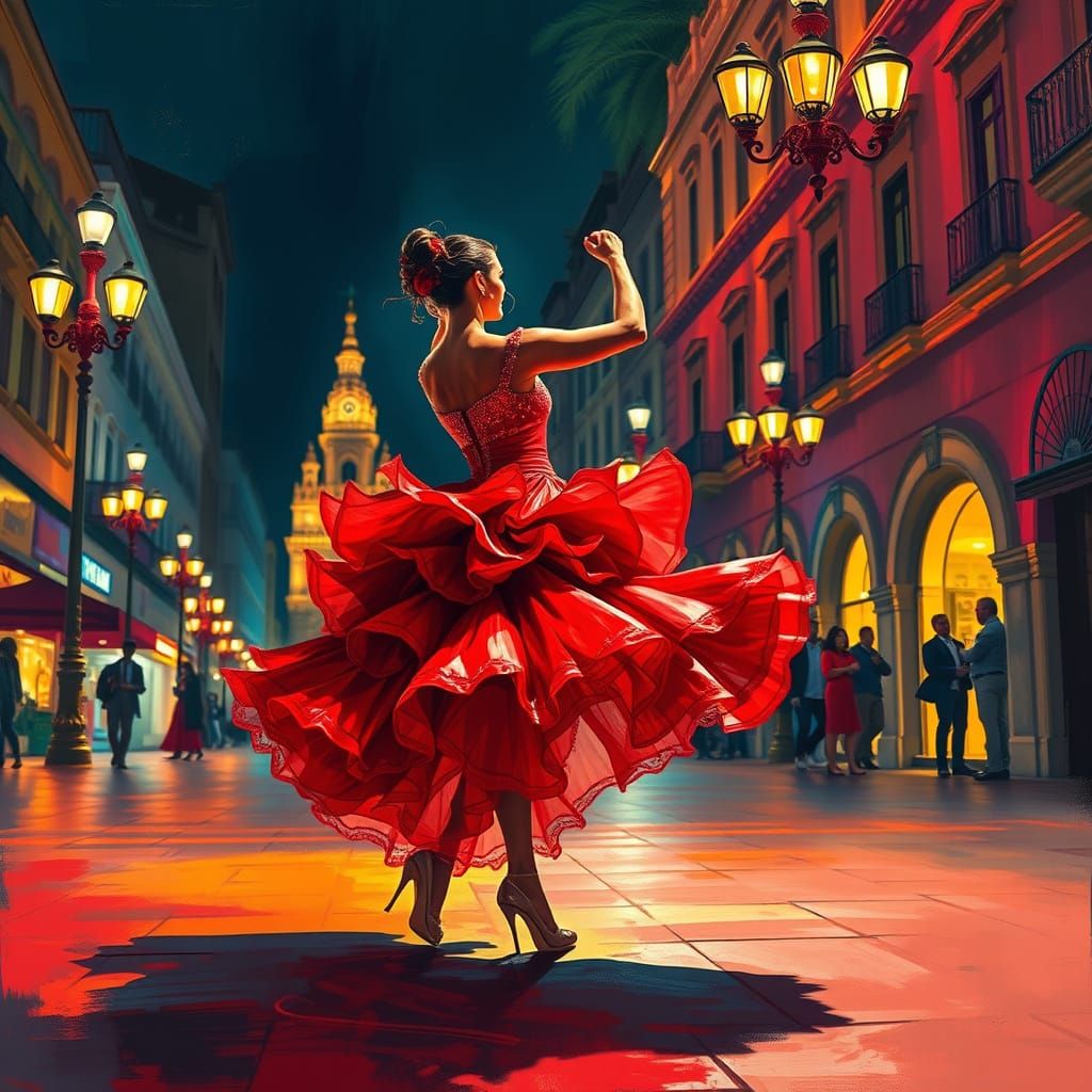 A striking picture of a flamenco dancer in a petal dress, twirling beneath Seville streetlights in a neon plaza. The image showcases surrealist elements with bold brushstrokes and fantastical details.