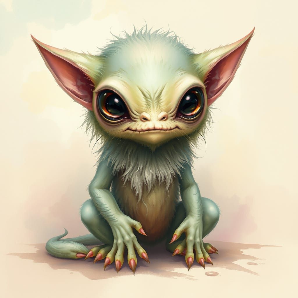 This image depicts a messy, otherworldly animal rendered in watercolor. The artwork emphasizes the creature's unique features and the fluid texture of the watercolor medium.