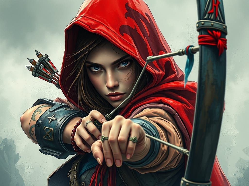 A digital painting of a hooded archer with piercing eyes, posed dramatically against a moody backdrop. The artwork blends digital ink and watercolor techniques with hyperrealistic textures, reminiscent of street art.