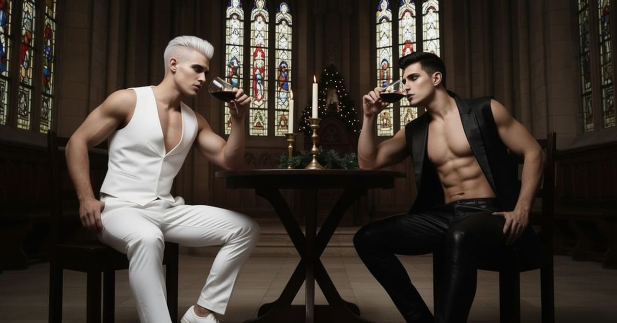 This image shows two shirtless vampires enjoying wine in a festive church crypt. Cinematic photography with dramatic lighting and shallow depth of field creates a realistic, high-resolution scene.