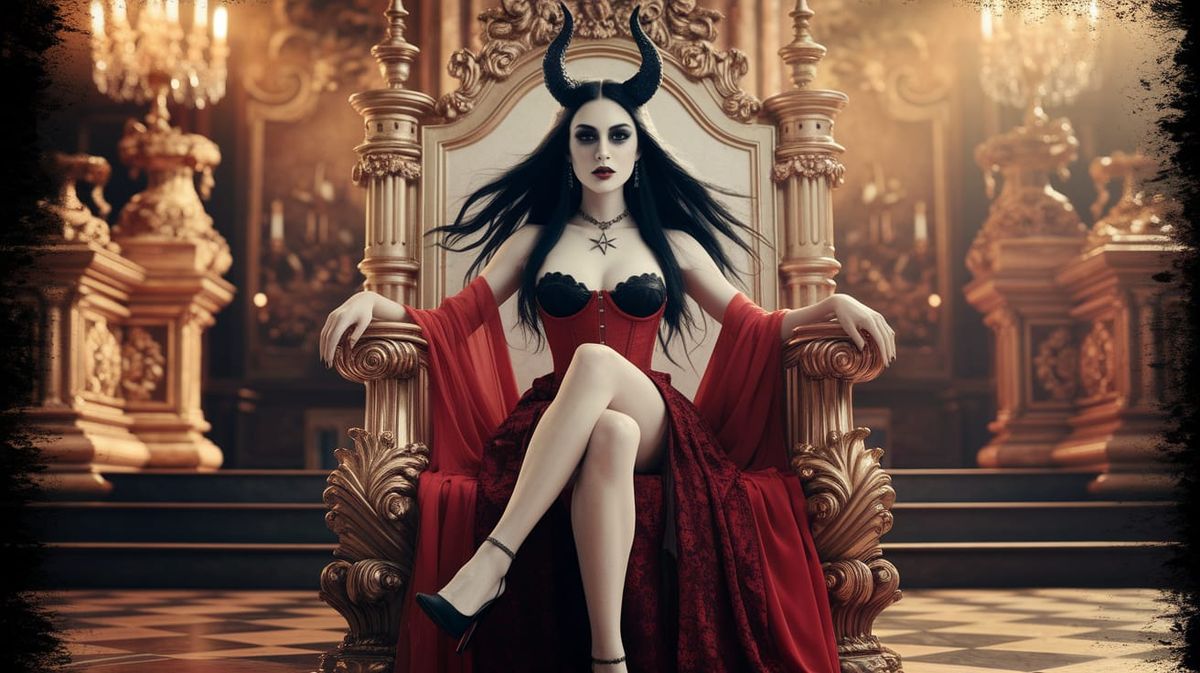 This image shows a gothic goddess with black hair and horns sitting on a throne in a Baroque hall. She wears pale makeup, a red corset, and a lace skirt in dramatic lighting, resembling a cinematic film still.