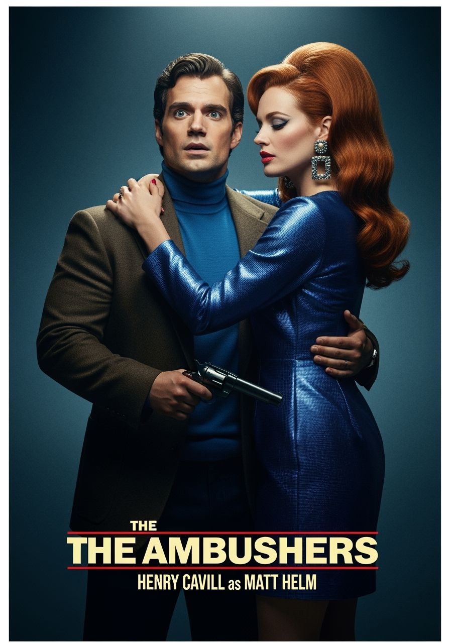 A cinematic movie poster for "The Ambushers" showcasing Henry Cavill as Matt Helm. Features dramatic lighting, film grain, and a tense atmosphere with a surprising twist.