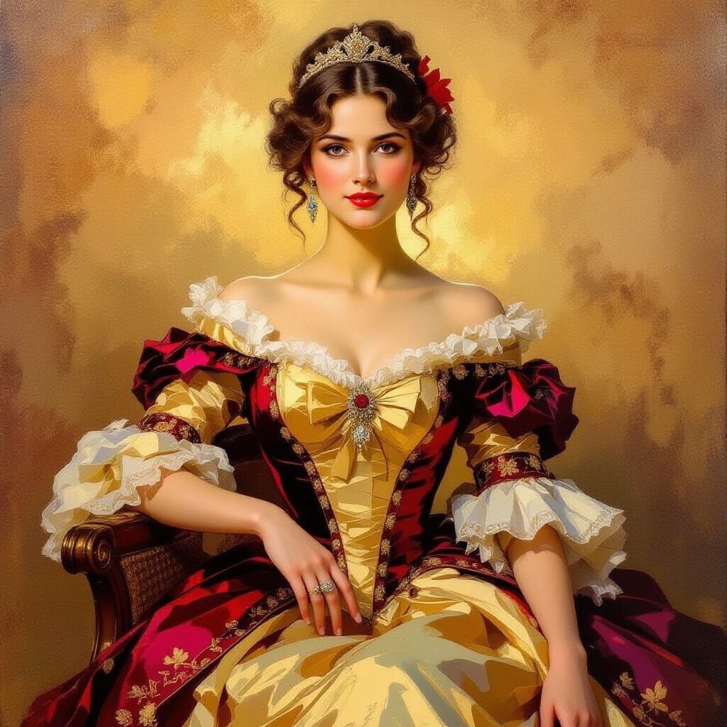 This image shows a portrait of a woman in an elaborate Russian gown, bathed in golden light. The impasto oil painting style features heavy brushstrokes and expressive realism.