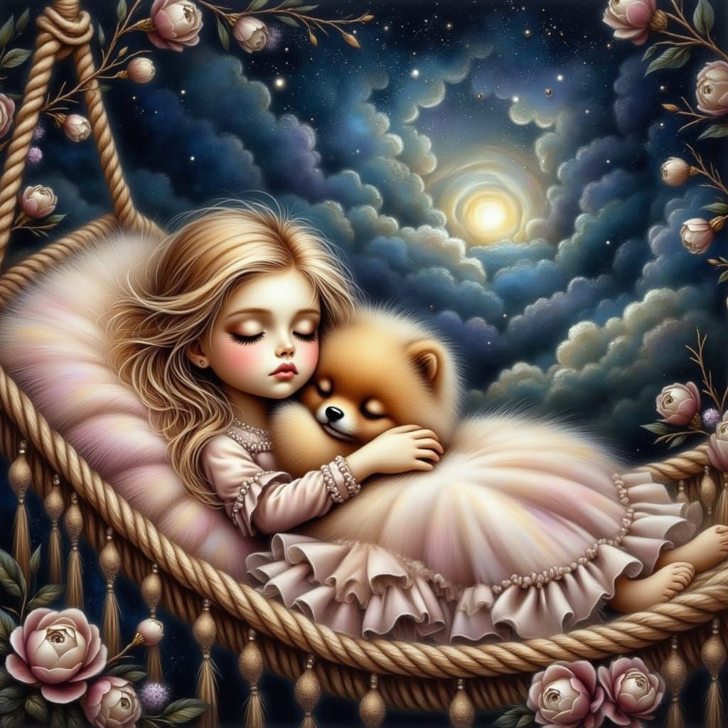 This image shows a serene, sleeping girl in soft pajamas, cradling a sleeping dog in a hammock, under a vibrant, star-studded night sky with delicate clouds, in a whimsical, watercolor-inspired style with dreamy, ethereal quality and soft lighting.