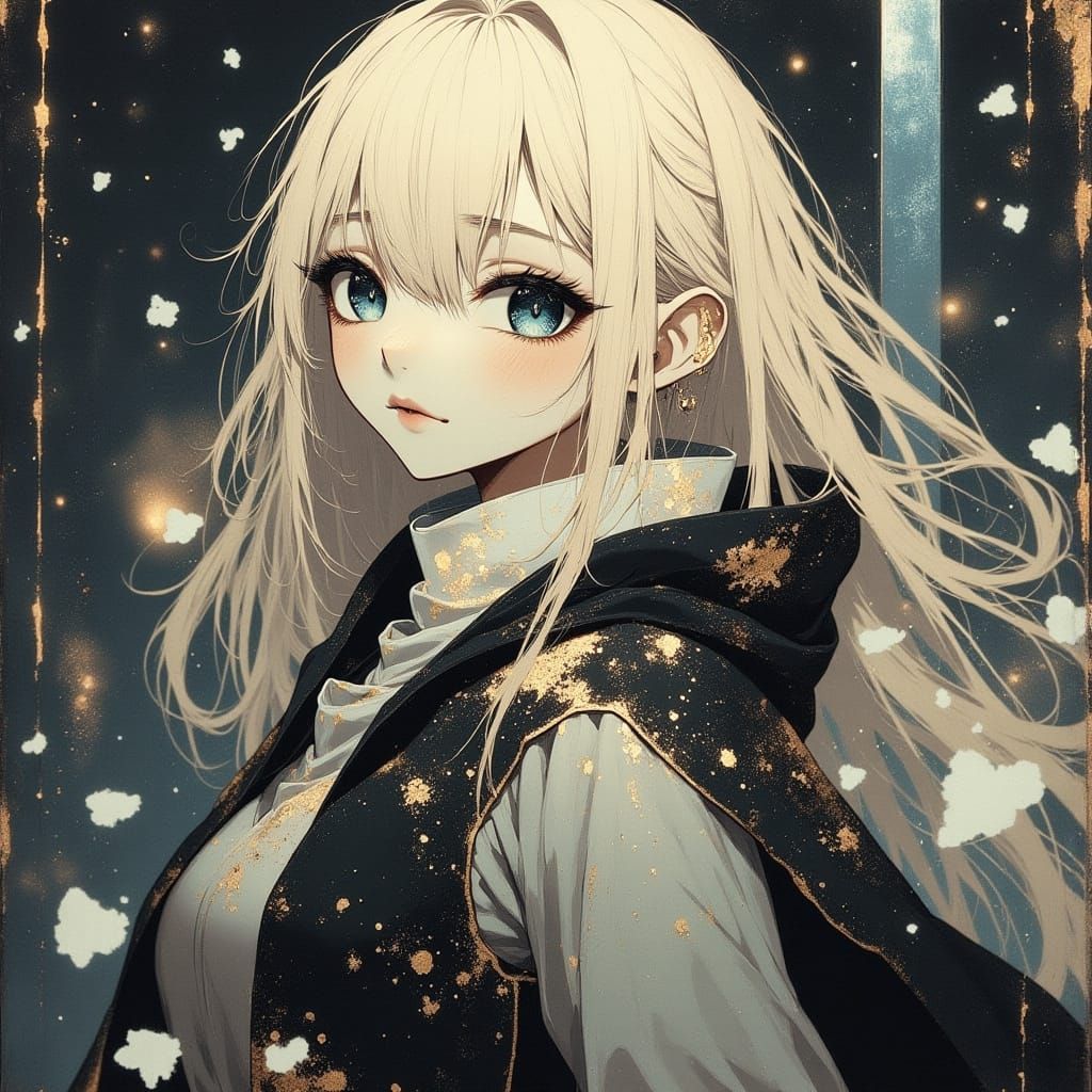 80s anime, beautiful woman with a delicate, porcelain-doll-like beauty with pale blonde hair, big blue eyes, and a fragile appearance, often...