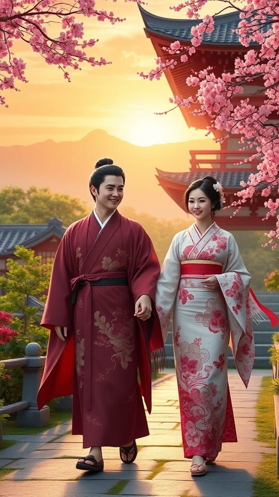 This serene image depicts a stunning Japanese temple surrounded by lush greenery and vibrant cherry blossoms, set against a breathtaking sunrise. A handsome couple in traditional kimono walk hand in hand, radiating happiness, in a beautiful blend of traditional and modern anime aesthetics.