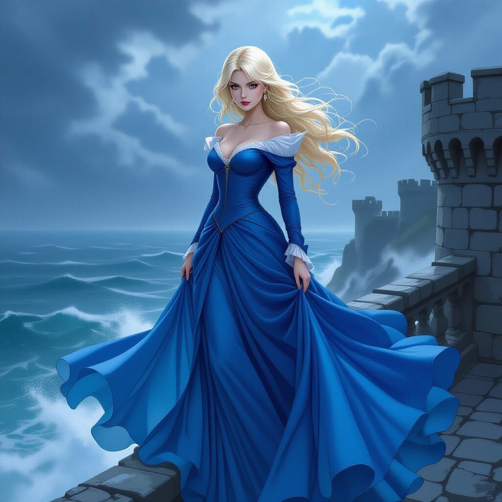 A beautiful blonde woman in a flowing blue gown stands on a windswept castle battlement. She overlooks a dark, stormy sea under a turbulent sky, rendered in a dramatic anime style with cinematic lighting.