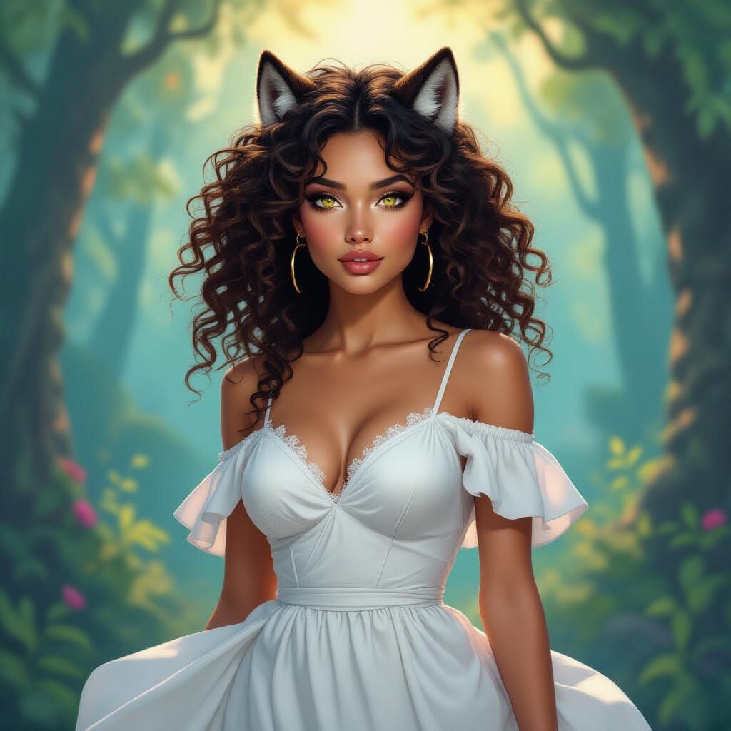 A striking image of a woman with curly brown hair and yellow eyes, elegantly dressed, undergoing a werewolf transformation amidst a vivid, mystical forest scene.
