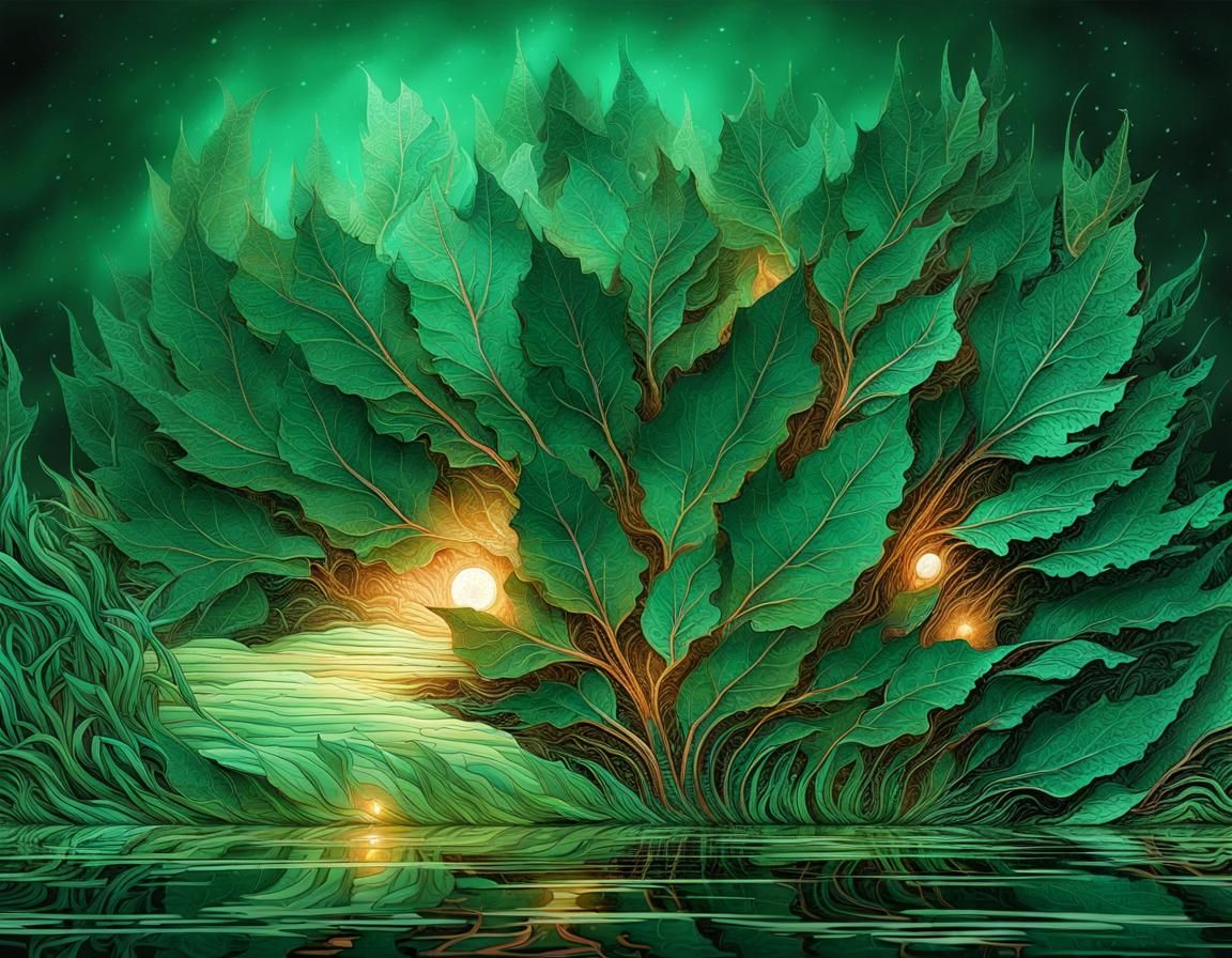 A striking picture of an underwater metalwork cityscape sculpture. The artwork features shiny metallic emerald green colors and intricate details, reminiscent of dark fantasy digital illustration.