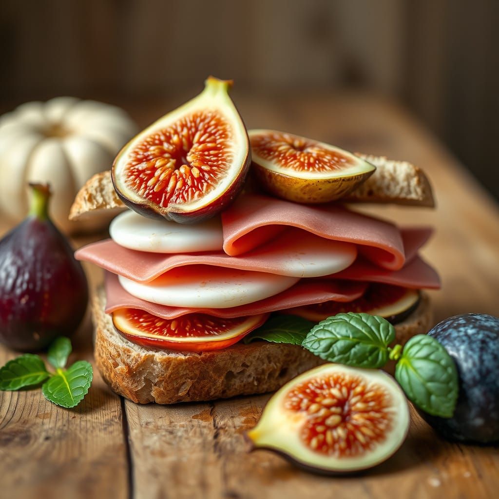 A mouthwatering still life of a sandwich, featuring fresh figs, cured ham, and creamy mozzarella cheese, set against a warm wooden backdrop, reminiscent of classic art pieces with a modern twist