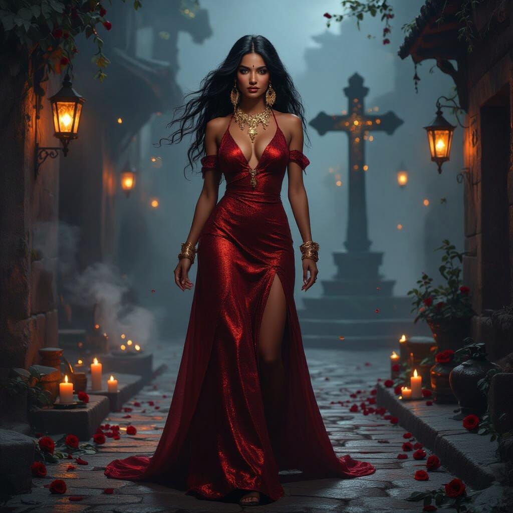 A striking portrait of a powerful Afro-Brazilian spirit with dusky skin and an intense gaze. She is adorned in a shimmering red dress and gold jewelry, embodying feminine power and spiritual wisdom.