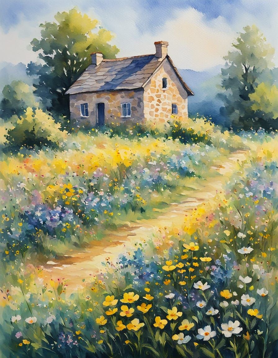 A vibrant impressionist landscape painting of a stone house nestled in a wildflower meadow. The acrylic art captures a serene, idyllic countryside scene in warm sunlight and gentle mist.