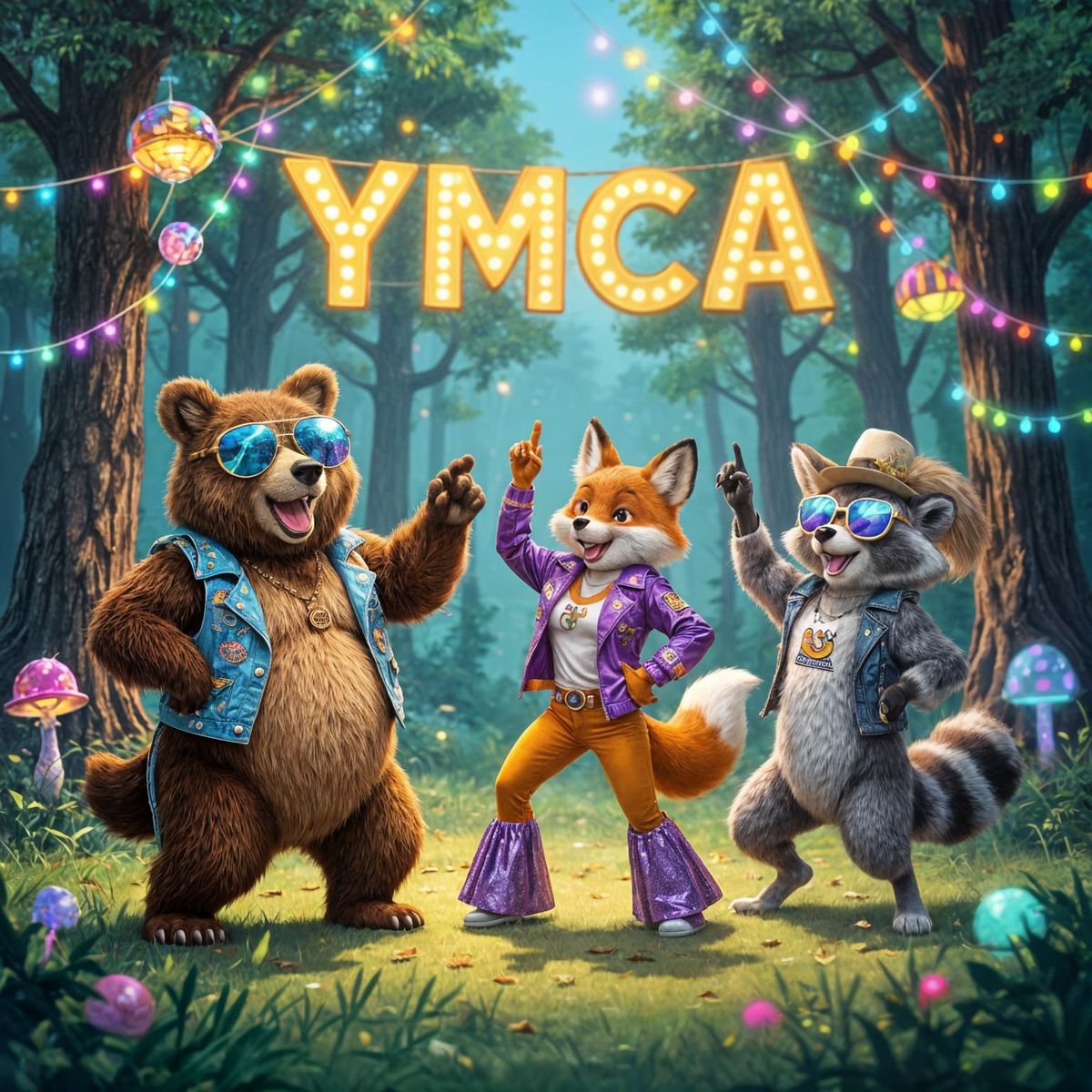 This image shows anthropomorphic animals joyfully dancing to the YMCA song in a vibrant forest clearing, capturing 1970s disco energy with magical forest elements and colorful lights.