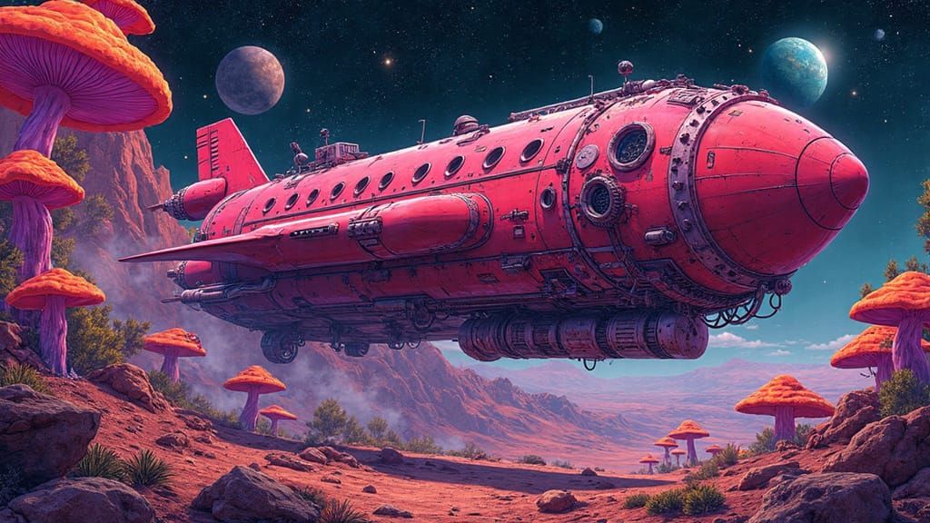A vibrant image showcases a cyberpunk rocketship on an alien planet. The scene features glowing mushrooms and plants, rendered with intricate details in a vintage sci-fi aesthetic.