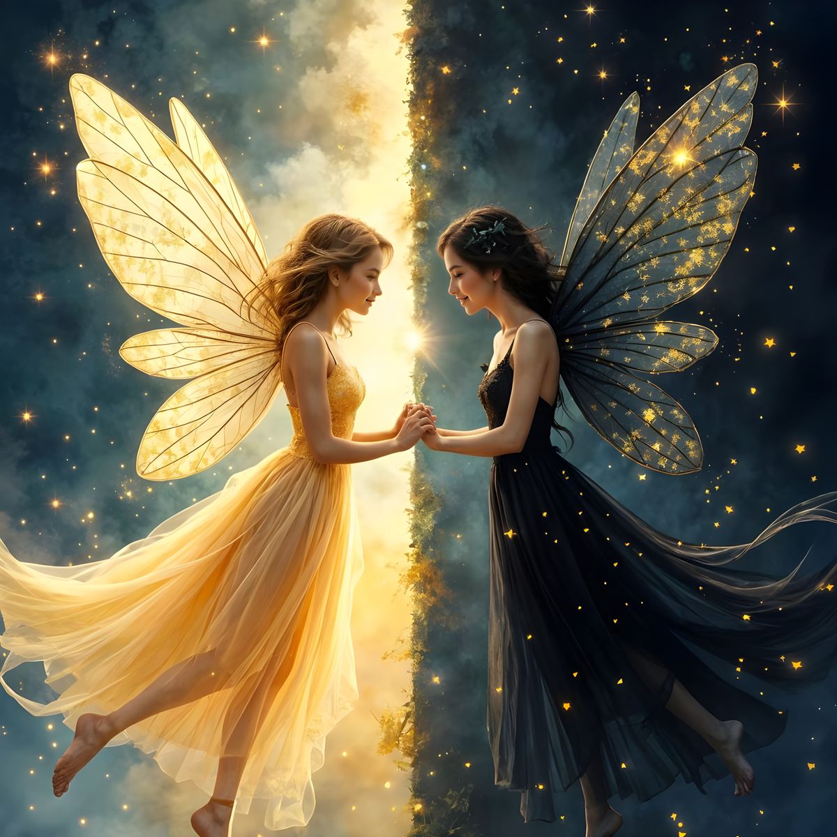 This image shows two fairies, one of light and one of night, touching hands across a dividing line. Rendered in a stylized watercolour and cinematic art style.