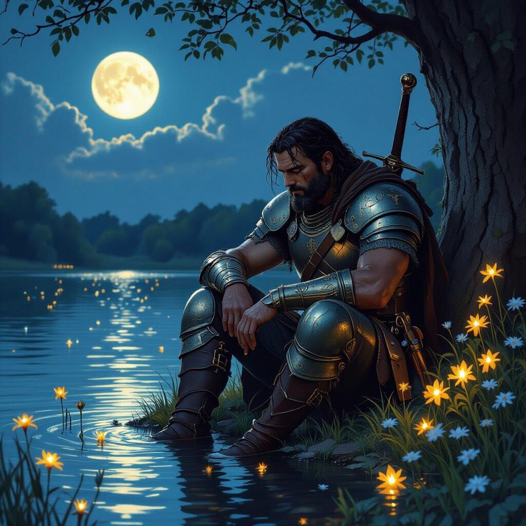 A striking picture of an aged warrior with worn armor and a long sword resting by a lake. The hyperrealistic image features luminous flowers, fireflies, and a dual-moon night sky. The style is reminiscent of digital painting.