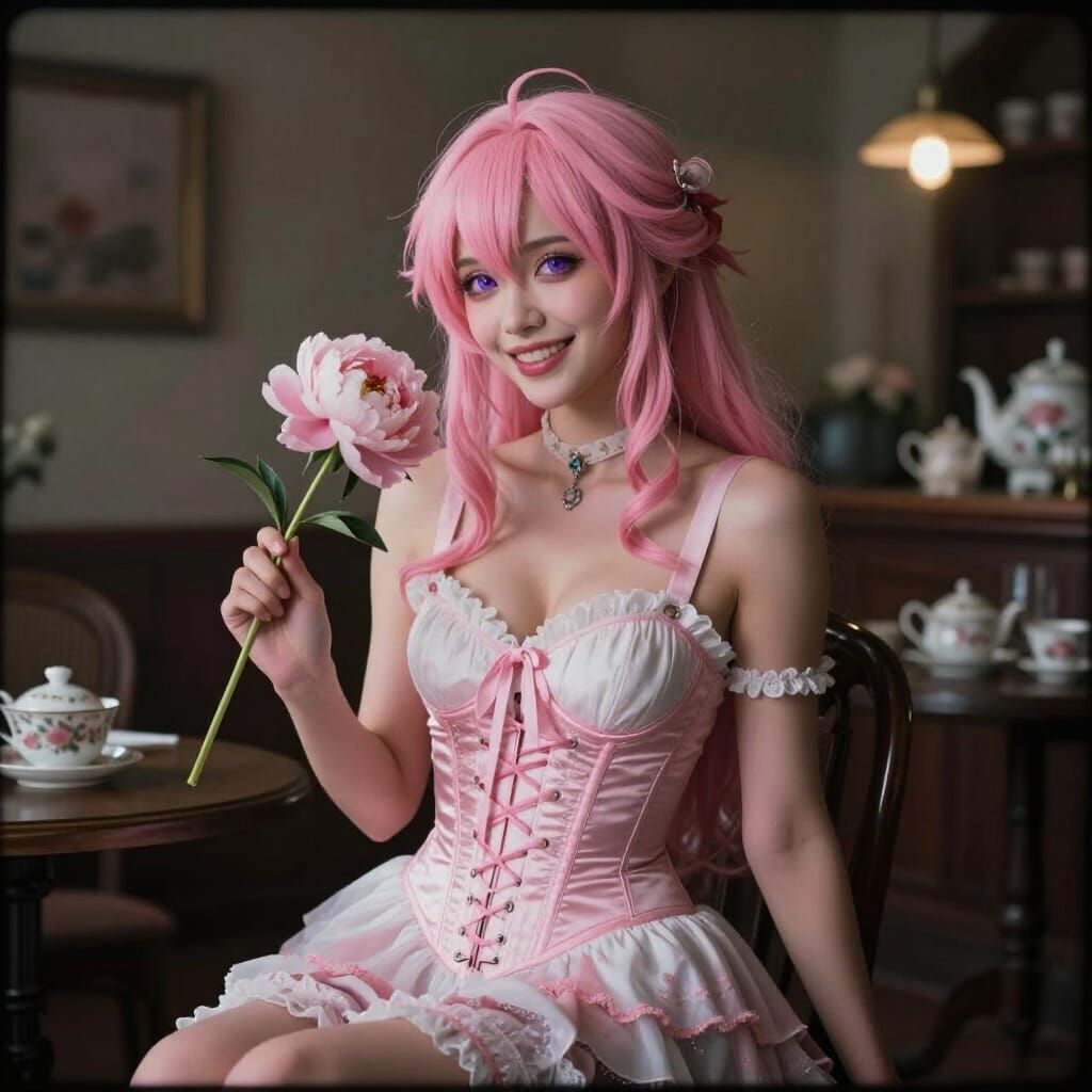 This image shows a smiling woman with pink hair and violet eyes in a Gothic corset dress, holding a peony in a tea room. Captured in a cinematic film style with atmospheric lighting.
