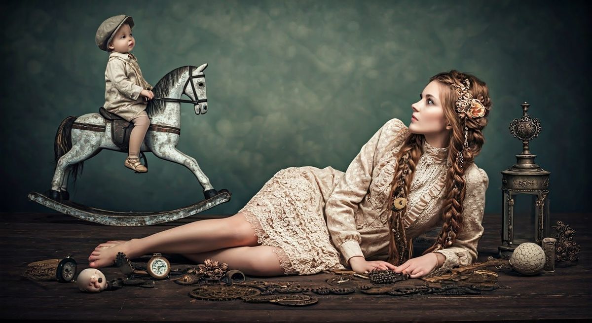 This enchanting scene features a young child riding a worn rocking horse in the background, while a woman with an ethereal quality reclines amidst a tapestry of curious objects, surrounded by vintage clockwork mechanisms, porcelain dolls, and leather-bound books, all bathed in a soft, crepuscular light, ...