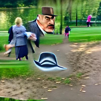 This image shows a detective, possibly Hercule Poirot, being approached by a frantic individual in a park. The scene suggests a mystery or urgent situation.