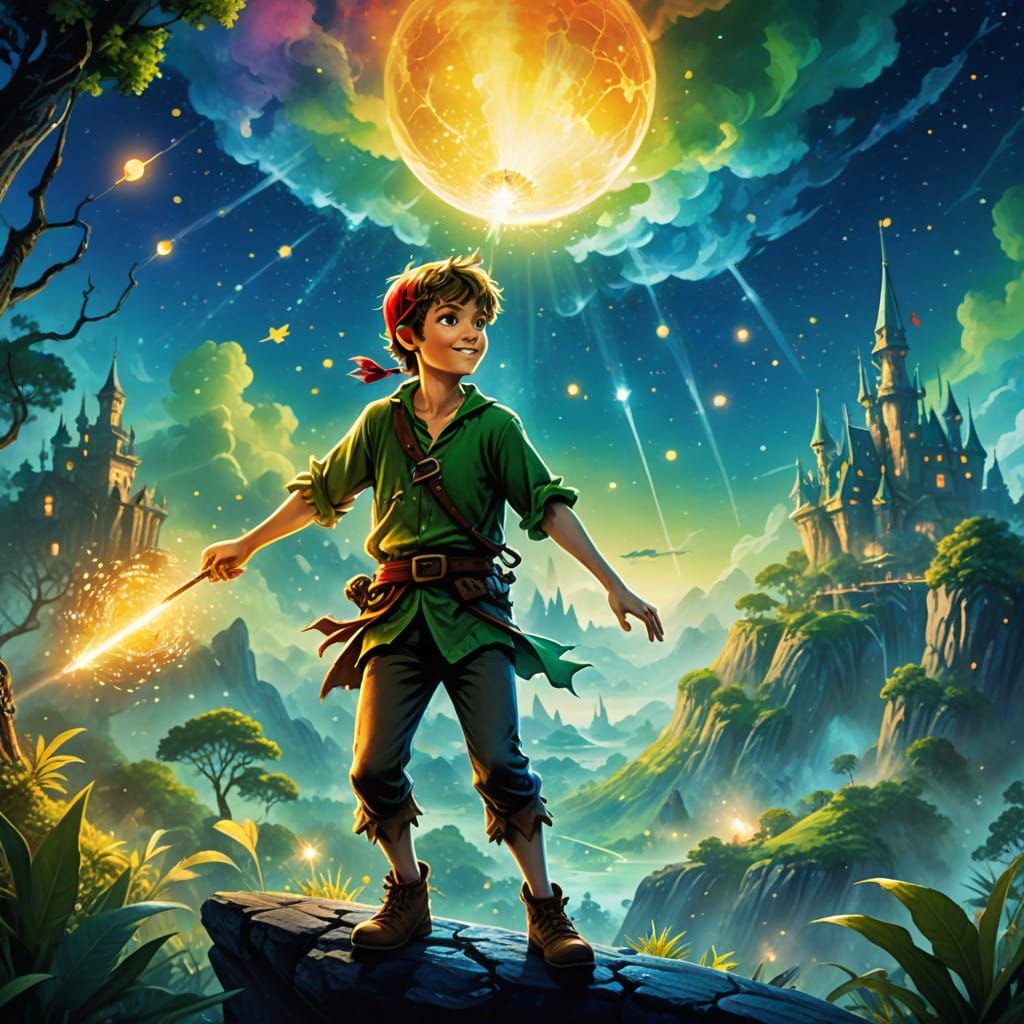 A vibrant, medium shot illustration of Peter Pan in Neverland. The fantasy image is full of glowing pixie dust, soft golden lighting, and misty atmospheric effects in an ink painting style.