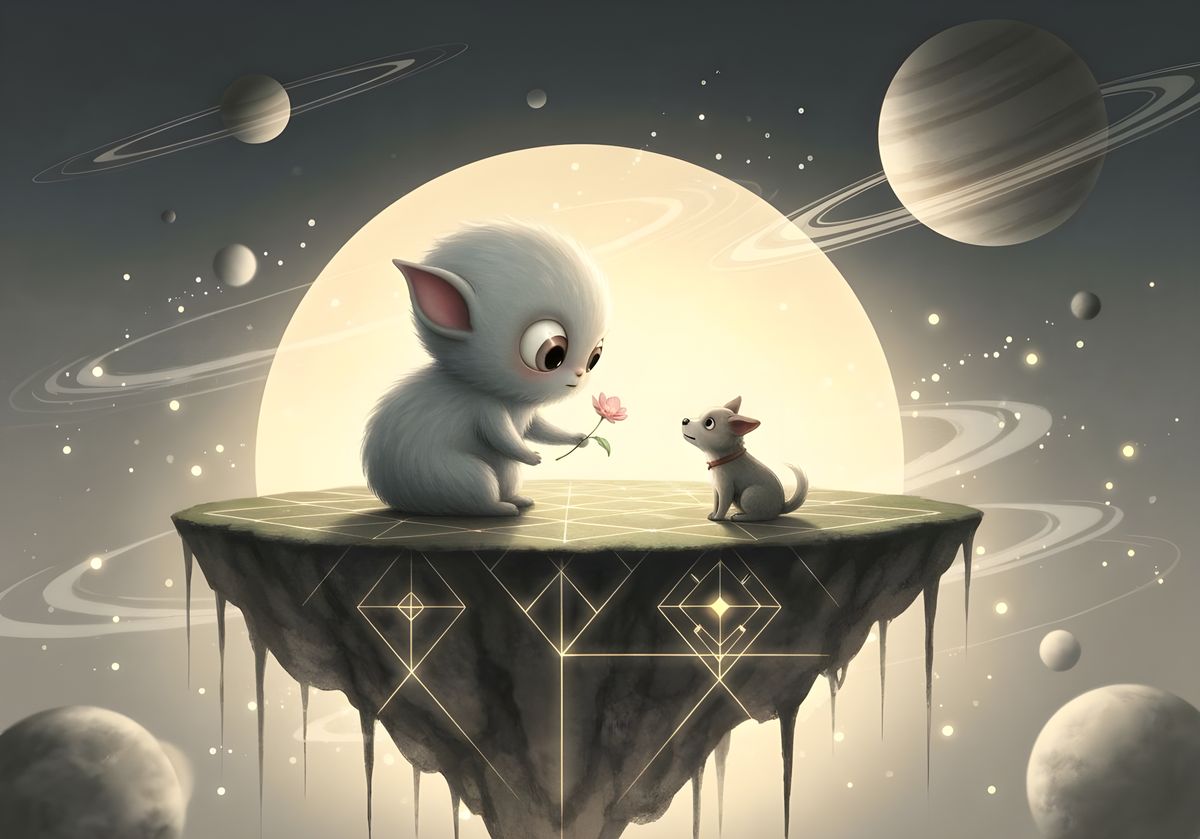 This image shows an alien offering a flower to a dog on a floating island. The art is in a minimalist sumi-e style featuring delicate brushwork, ethereal glows and a soft colour palette.