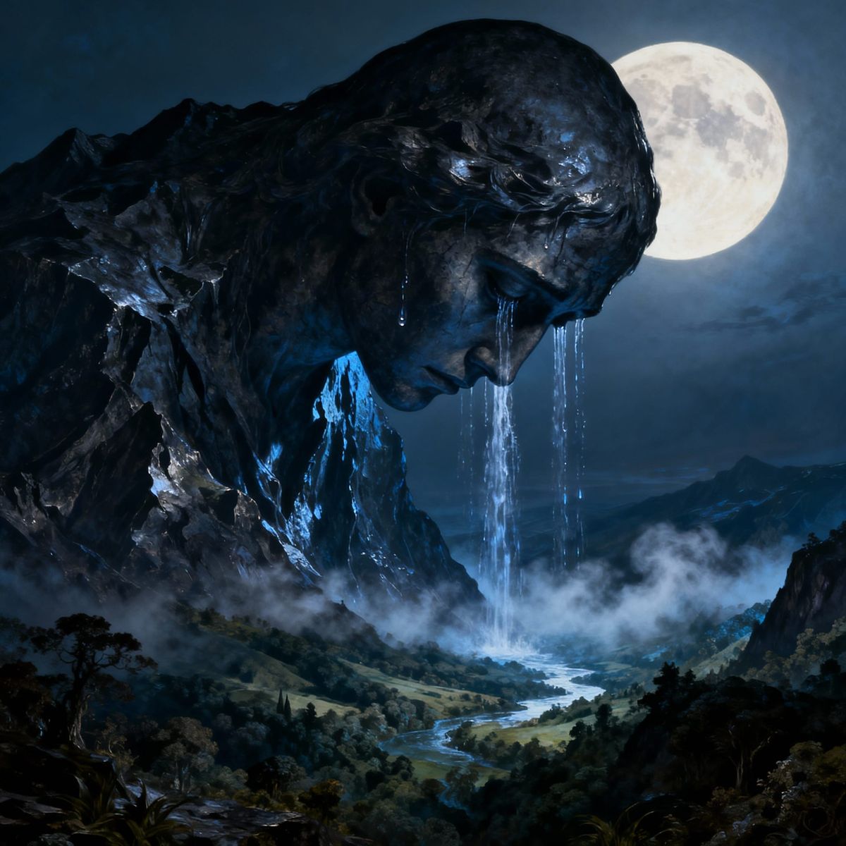 This image shows a mountain resembling a bowed figure, weeping into a lush valley under a soft full moon. It features a primal, forceful aura with rich texture and dramatic lighting, evoking sorrow and renewal.