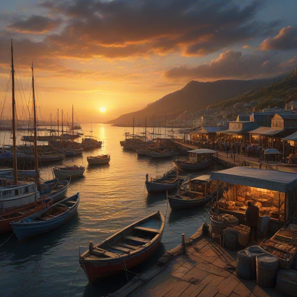 Generate your own vibrant coastal sunrise images, featuring bustling harbors and returning fishing boats. Free and easy AI art creation.