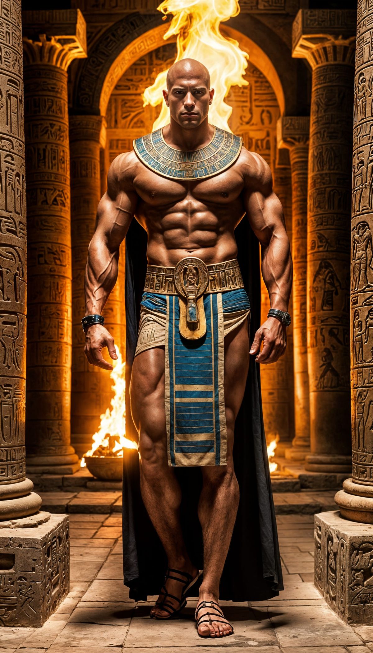 This image shows a muscular, bald man in ancient Egyptian clothing standing in a temple. Torches light up the columns covered in hieroglyphics, with a flaming altar creating dramatic lighting.
