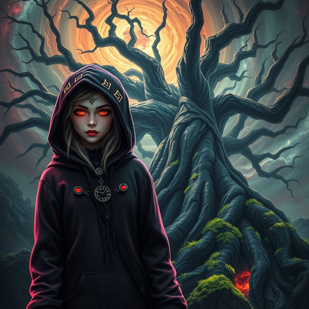 Young lady in hooded onesie deathcore fashion, intricate goth makeup, striking accessories, glowing neon red eyes, in then back ground A colossal, ancient tree whose bark is etched with forgotten runes, its branches reaching towards a swirling, nebulae-filled sky. Luminescent moss clings to its gnarled ...