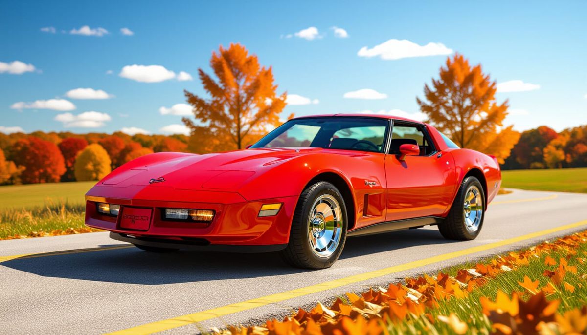This image shows a classic fire-red Corvette parked on an autumn road. Golden leaves surround the car under a clear blue sky, rendered with ultrarealistic detail.