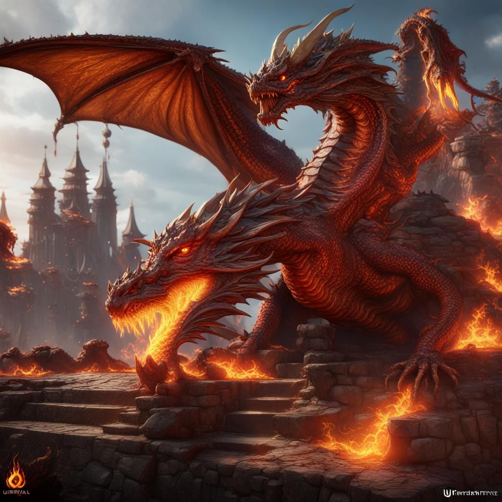 A vibrant digital painting of a fire dragon. The artwork employs complementary colors and intricate details, reminiscent of fantasy concept art trending on Artstation.